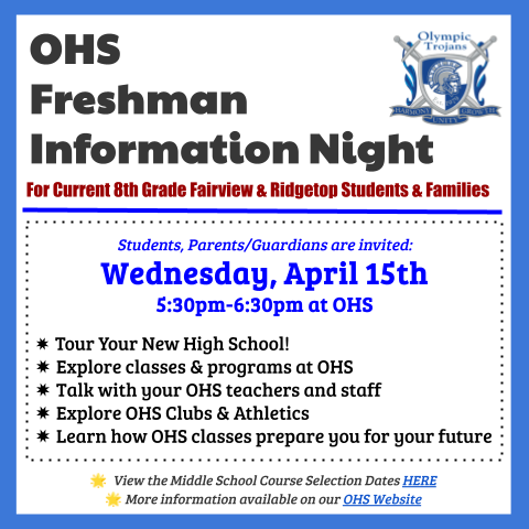 OHS FRESHMAN REGISTRATION! Current 8th Graders - Class of 2030 High School Registration Dates for the 2026-27 School Year Monday, April 13 Preview High School Registration! Fairview - in Advisory R...